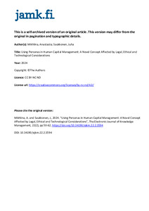 Nowadays, Human Capital Management (HCM) is seen as a service whose consumers are current and potential future employees. Some trends pushing the HCM operations to new approaches are the rise ofindividualization and flexible workas well as the changing expectations and values that new generationsX and Y bring to the way people management is evolving.Companies need new tools and approaches along the lifecycle of their employee relations –from applicant pool construction and maintenance to recruitment and training. In SME companies the management is likely to addressHCM needs on a very individual level. However, larger companies need to categorize their human capital into certain entitiesto mass-customize their HCM services.This paper explores theproponents and challenges inthe usability of the Persona concept for HCM. Persona is a service design approach widely applied in marketing, and a few research papers have argued that personas may have a role in improved people-orientedHCM. Personas –as commonlyused in the sphere of marketing -aim to create a limited set of archetypes that differ from each other. Whereas the traditional customer and employee clustering methods leaned heavily on demographics (age, experience, job title,etc.), the persona concept adds psychographic elements like values, and social engagement to form the basis of service development and delivery. The contents of personas are often a mixof real-lifedata-backedfacts of people existing and some imaginary attributes. Different personas will likely request differentservices to feel fully motivated and supported. This paper studiesthe awareness of personas among HCM experts across industries and countriesas well as the ideas for personas in HCM by marketing professional more used with the use of personasin their profession. The qualitative study based on twelve semi-structured individual interviews was conducted in November-December 2022. The results indicate that the HCM community knows about the persona conceptand early adoptions or plans for implementation are ongoing.However, the current usage of personas is mainly focused on employer branding and recruitment(the most marketing-type of HCM actions),and only in a few cases does the usage coverthe spectrum of internalHCM processes. The study also revealed some limitations for HCM that are not present in the marketing field. Demands for transparency, equality, data privacy, and personal integrity set challenges in clustering the workforce. The novel technical solutions such as Artificial Intelligence (AI)in persona creation offer efficiency and a deeper analytical foundation in persona development but also bring in new questions of transparency and ethicality of their use.The results indicate the further need for research on best practices of creating and using Personas in a way that ethically and legally serves the interests of both the company and the employee.